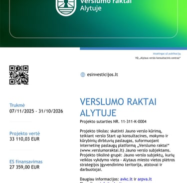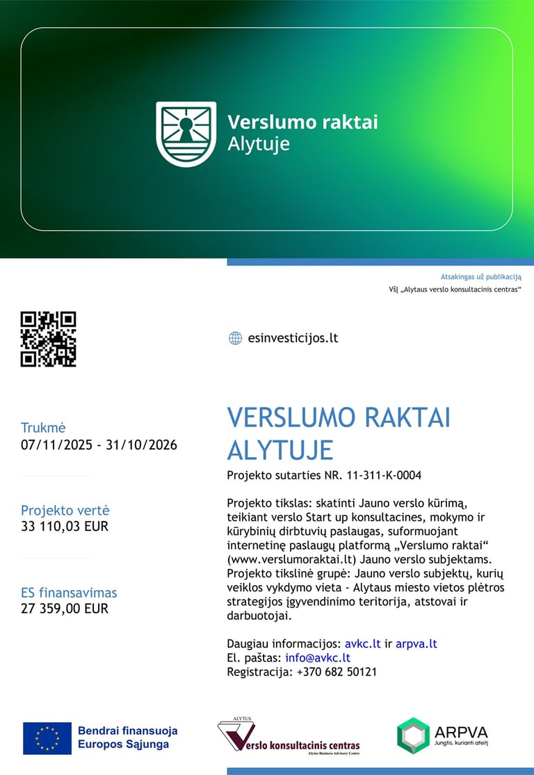 Projekto lyderis: Alytaus verslo konsultacinis centras, Pulko 5A, I a. , Alytus, www.avkc.lt